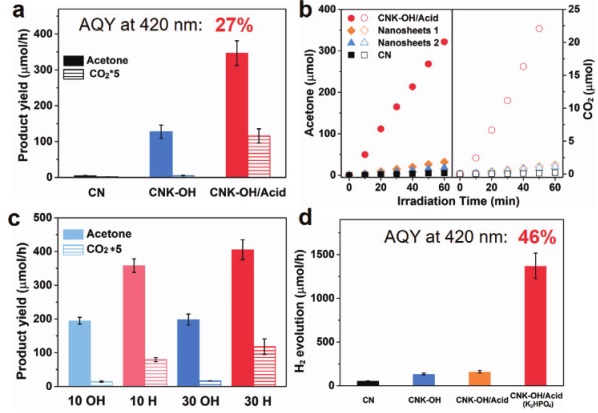 研究者开发了一种简单、可控的策略,通过切换层间种类来控制聚合物碳氮化合物的剥离-再组装状态。该研究具有以下三个优势:1. 在温和溶液中,超薄纳米薄片的产率高达48%;2. 通过切换剥离-再组装碳氮聚合物状态,具有很高的可逆性;3. 具有可调性能的剥离重组碳氮化合物可用于光催化降解异丙醇和产氢,在≈420 nm时,IPA降解和产氢效率分别为27%和46%。