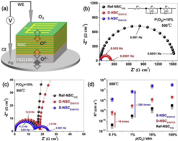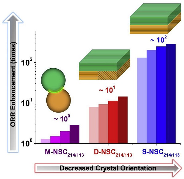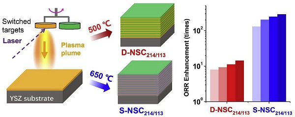 摘要图: 不同晶体取向的多层异质结构薄膜电极制备方法示意图及其ORR性能提升程度对比。(S-NSC214/113和D-NSC214/113分别为单一晶体取向和双晶体取向异质结构薄膜;多层异质结构薄膜中的黄色为Nd0.5Sr0.5CoO3-δ (NSC113)层,绿色为Nd0.8Sr1.2CoO4±δ (NSC214) 层)。