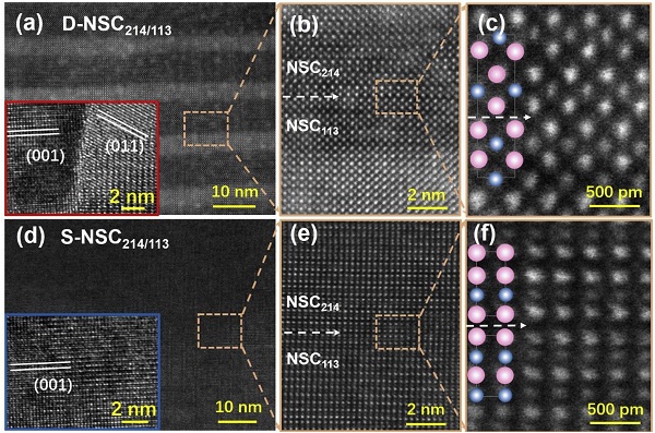 (d)、(e)和(f)S-NSC214/113的截面结构图(图d的嵌入图显示该样品晶体取向不同)。