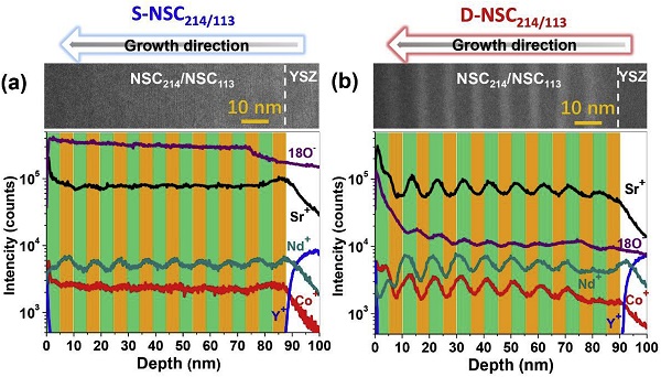 (a)和(b)18O2/16O2交换后18O–和阳离子在S-NSC214/113和D-NSC214/113异质结构薄膜中的分布情况及截面对应结构对比。