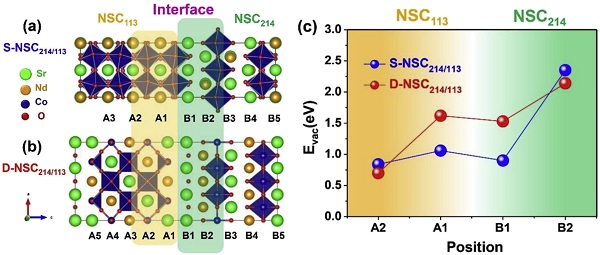 (c)两种结构中NSC214/NSC113界面处的氧空位形成能(Evac)对比。