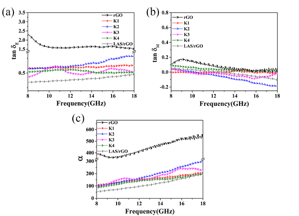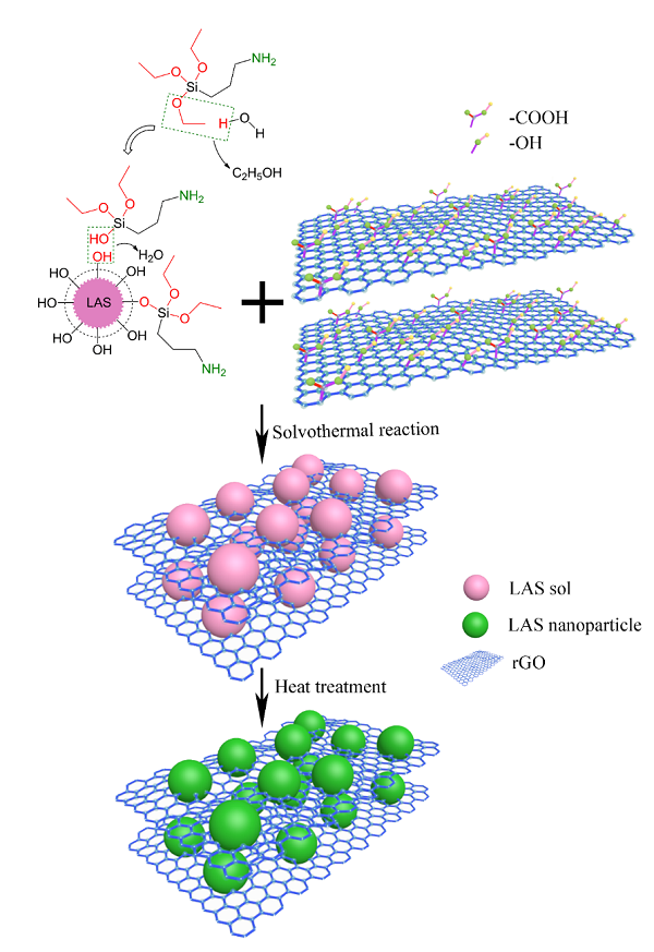 近年来,石墨烯以其独特的二维结构和超低密度、高比表面积、优异的环境稳定性等优异性能,作为一种微波干扰屏蔽材料而受到广泛关注。然而,大多数电磁波(EM)入射到石墨烯表面时都会经历反射过程,因为石墨烯的复介电常数过高,阻抗匹配较差。相对复介电常数和相对复磁导率直接决定了材料的吸波性能。目前采用较多的方法为将石墨烯与各种磁性粒子复合,通过电磁参数的协同作用调节阻抗匹配,增强吸波性能。最常用的为铁氧体,但单一铁氧体复合材料存在吸波频带窄的问题,为了改善这一问题往往还需加入其他材料,使制备过程繁琐。另一种可以调节石墨烯阻抗匹配的方式为在石墨烯中加入拥有相对较低的介电常数实部(ε′=1-5)和低介电损耗角正切 (tan δ ≤ 0.01)的透波材料。锂铝硅(L A S)微晶玻璃作为一种重要的微晶玻璃体系,由于其超低热膨胀率、高温稳定性和化学耐磨性具有广泛的应用。锂铝硅(L A S)具有超低的介电常数 (ε′= 2.78 ,tan δ =0.01)。最近,将石墨烯与陶瓷材料复合已成为新的研究热点。