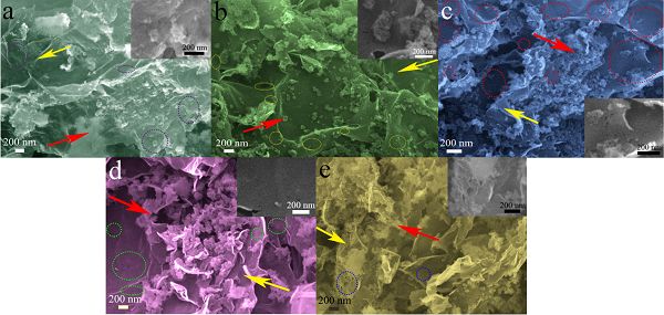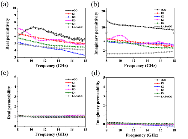 采用三步法成功地制备了LAS/rGO-KH-550纳米复合材料。rGO表面由于热还原过程形成的缺陷和表面少量残留基团会产生偶极极化和相应的弛豫损耗。LAS粒子具有透波性,可以降低rGO的介电常数,减少电磁波在材料表面的反射。通过KH-550的加入增强了rGO与LAS粒子的界面结合,从而进一步调节了复合材料的介电常数,rGO上附着的LAS粒子形成的微型电容器结构增强了复合材料的吸波性能。LAS/rGO-KH-550复合材料在X和Ku波段具有较强的电磁波吸收能力(RL=-62.25 dB),有效吸收频宽达到6.64 GHz,而且填充量低,仅为20 wt.%。在X和Ku波段整体都有超过-20 dB的有效吸收。由于其薄、轻、宽的吸波性能,这项工作将为开发各种新兴应用的高性能吸波材料开辟新的途径。