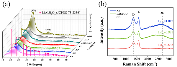 图4 rGO、LAS/rGO和LAS/rGO-KH-550的XRD及Raman图