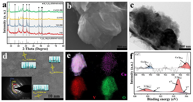 (e)循环过程中CuVO-300的嵌入机理与相转变示意图。