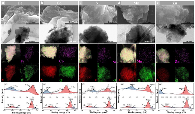 (a-e)Fe2+、Co2+、Ni2+、Mn2+、Zn2+预嵌入的Fe/Co/Ni/Mn/ZnVO-300样品的SEM图像、TEM图像、元素分布图像与对应预嵌入金属离子、V元素的XPS图谱。