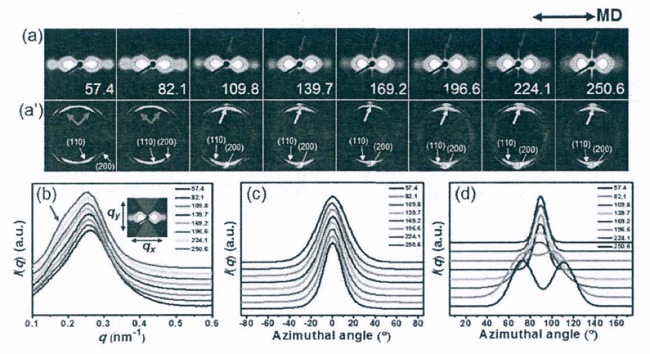 电池使用寿命和充放电稳定性的提高是3C领域对锂离子电池的市场呼吁。微孔隔膜作为电池的重要组成部分,对其制备过程中涉及的流动场诱导结晶、机械能和热效应对微孔成核与生长的作用、片晶簇无定形区的变形模式及其在应变-温度空间的变形机理等物理问题成为李良彬课题组需要攻克的难关,他们通过控制工艺参数来改变流场强度以得到不同结构的高密度聚乙烯(HDPE)预制膜,并结合X射线小角散射(SAXS)和X射线广角散射(WAXS)检测了微孔膜的长周期、片晶侧向尺寸、取向度和纤维晶含量等参数,为HDPE微孔膜的研究积累了基础数据和产品开发思路,图4为部分检测结果。