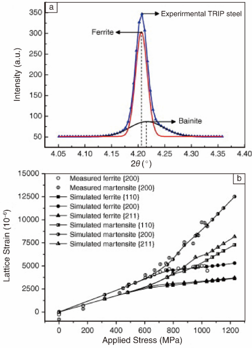 Jia N等利用HE-XRD技术对具有复相组织的先进高强钢微观力学行为进行了原位研究。对同时存在铁素体、贝氏体和马氏体的多相高强钢,利用其倒易空间分辨率高的特点,对(200)晶面的重叠衍射峰进行分离,如图5所示,确定了不同相在形变过程当中的晶格应变情况[4]。