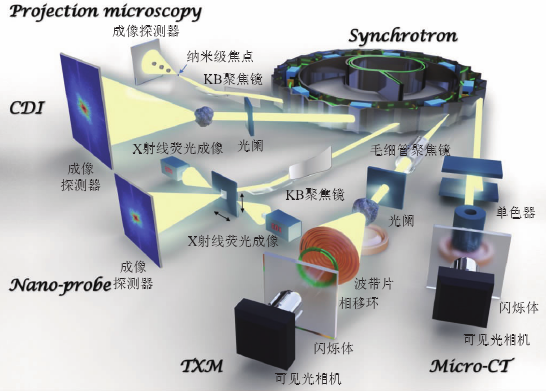 图6列出了基于同步辐射装置的常用X射线成像技术示意图[5],包括了X射线显微CT成像、基于波带片的纳米分辨全场成像(TXM)、纳米分辨探针扫描成像(Nano-probe)、相干衍射成像(CDI)和几何放大投影成像(Projection microscopy)。