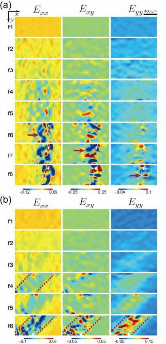 钟政烨等人基于第三代同步辐射X射线,利用原位表征技术对两种粒径配比的高体积分数SiCp/Al复合材料在准静态加载下的力学性能进行了研究,并首次使用X射线数字图像相关方法(XDIC)表征了SiCp/Al的变形应变场(图9),并结合宏观应力-应变曲线和细观应变场对变形损伤过程进行了分析[8]。