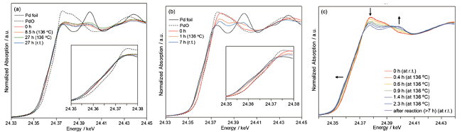 Tamao Ishida等人采用原位XAFS研究了Pd的活性尺寸和反应过程中化学状态和结构的变化。图10为Pd/ZrO2和Pd/Ceo2的XANES(X-ray absorption near edge spectra)检测结果,研究表明单个Pd原子是无活性的,Pd易于在具有较低吸附和迁移能量的ZrO2表面扩散形成小尺寸的Pd团簇,有利用脱羰过程的进行[9]。