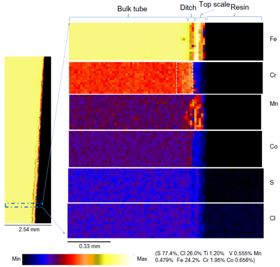 Iman Ja’baz等人在澳大利亚同步加速器的XFM光束线,对合金横截面上Fe、Cr、Mn、Co等元素的空间分布情况进行了SXRF和XANES检测,部分结果见图11 ,并分析Cr含量和氧化、渗碳等行为对12Cr1MoVG管子腐蚀性能的影响[10]。