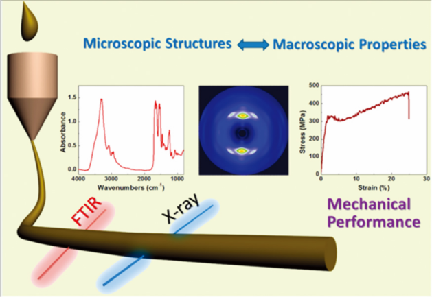 复旦大学陈新课题组对单根丝纤维进行了红外显微谱学研究[12],结合了同步辐射红外光谱技术和同步辐射X射线衍射技术,对内部丝蛋白的二级结构进行了定量分析,得到了微观结构与纤维宏观力学性能的关系,如图13所示。