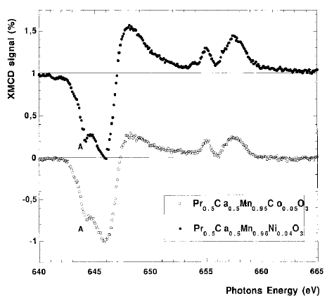 O.Toulemonde等人利用SXMCD研究了掺杂亚锰酸盐中Co2+和Ni2+阳离子的电子结构和磁矩[13],如图14所示,结果表明Co、Ni磁矩与Mn磁矩对称,而与Cr磁矩相反,意味着它们的作用机理也是不同的。