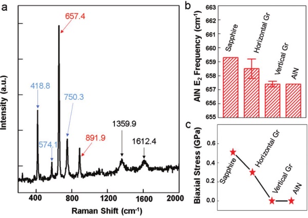 (b) 氮化铝在蓝宝石、垂直石墨烯、横向石墨烯和块体氮化铝上的拉曼位移;