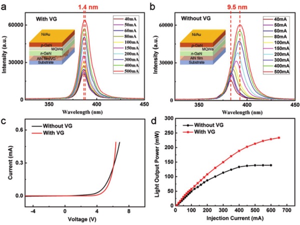 (d) 有无VG的紫外LED器件的光输出功率与注入电流的关系。