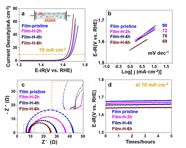 2.氢气热处理,电化学还原后对薄膜OER性能的影响:含有氧空位的PBSCF薄膜OER性能明显的提高,Tafel斜率下降,OER的Rct阻值下降明显,不同方法在PBSCF薄膜引入的氧空穴体现出较好的稳定性。