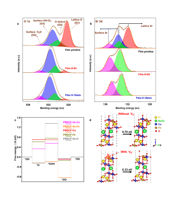 3.氧缺陷对PBSCF的OER性能有利影响:含有氧空穴的PBSCF薄膜,表面氧及氧空穴的浓度更加高,对OER的反应更加有利。含有氧空穴的PBSCF薄膜,表面Sr含量更加高,表明更加容易生成Sr-OH。通过不同步骤的吉布斯自由能分析,含有氧空穴的PBSCF,以Co为活性位点时,速控步(*OH−*O)的吉布斯自由能由0.70 eV下降至0.33 eV。
