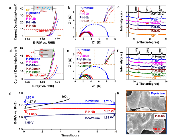 g)原始PBSCF,P-H-6h,P-V-20和IrO2催化剂在电流为10 mA cm-2的计时电位曲线;