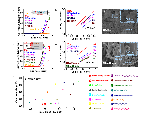 g)在这项工作中经过电化学还原(NT-PBSCF-V-20 min和NT80-PBSCF-V-20 min)与最近报道的钙钛矿催化剂电流在10mA cm-2的过电位和Tafel斜率的比较图。