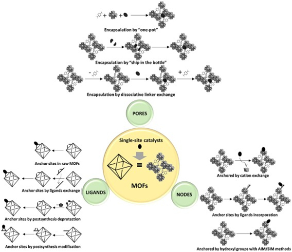 图 1 MOF的配体、节点和孔道负载单位点催化剂的不同方法的示意图
