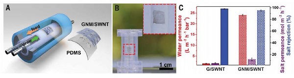 图1 GNM/SWNT杂化膜进行高效水脱盐处理示意图