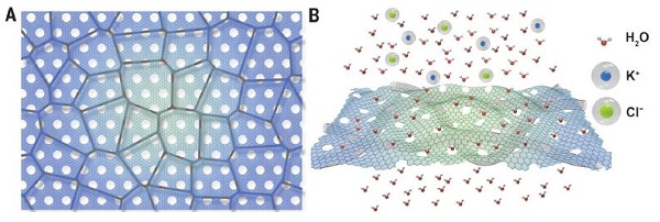 海水的脱盐和净化是持续获得洁净水源的理想途径之一。在这样的背景下,具有原子级厚度的纳米孔二维材料因其表现出高效的分离性能以及高度的透过率而被认为是制备超薄水处理薄膜的潜在材料。理论计算预言,单层纳米孔二维薄膜可以提供超快的水渗透和选择性分离性能。实验研究也已经表明,纳米孔石墨烯薄膜在脱盐处理方面具有良好的表现。然而,目前的此类石墨烯材料的制备还限制在微米尺度。因为随着石墨烯面积的增大,面内晶界的存在和严重削弱材料的机械性能,致使在引入孔的过程中进一步破坏单层石墨烯的结构完整性,从而在分子水平上失去分离溶质离子和水分子的功能。因此,如何有效制备具有足够机械强度的大面积纳米孔二维薄膜依然是亟待解决的问题。