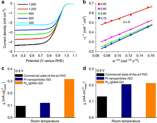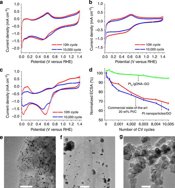 本篇论文报道了在基因组双链DNA-氧化石墨烯上沉积Pt簇(直径r<1.4nm)复合材料的合成及其高效的氧还原电催化性能。氧还原反应的起始电势、半波电位、比活度、质量活度、加速耐久性试验(10,000个循环)和循环伏安稳定性(10,000个循环)等优异电化学行为主要归因于纳米级Pt团簇与DNA-氧化石墨烯复合物之间强列的相互作用改善了铂团簇的电子结构。此外,作者还证明了Ptn/DNA-氧化石墨烯复合材料所具有环境超耐久性和稳定性,对高性能燃料电池和其他电池至关重要。