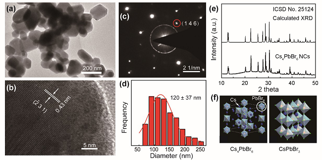 Figure 1. Cs4PbBr6纳米晶的形貌与结构表征。