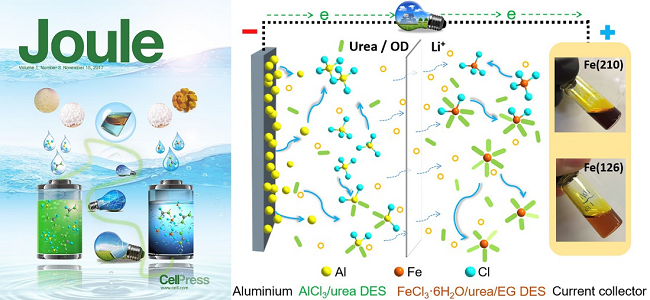3.A Low-Cost High-Energy Hybrid Fe-Al Liquid Battery Achieved by Deep Eutectic Solvents, Joule,1, 623 (2017), DOI: 10.1016/j.joule.2017.08.013.
