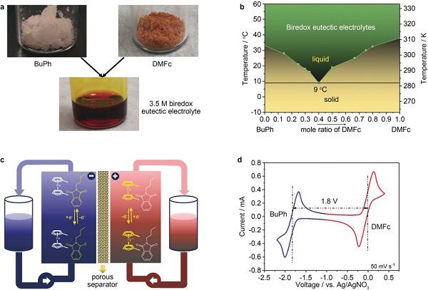 本文首次利用苯邻二甲酰亚胺作为活性小分子和尿素以及锂盐设计了一种基于低共熔溶剂的负极活性电解液。通过调控三者之间的摩尔比例,可以实现对其物理和化学性质的调控,从而实现高能量密度的液流电池。