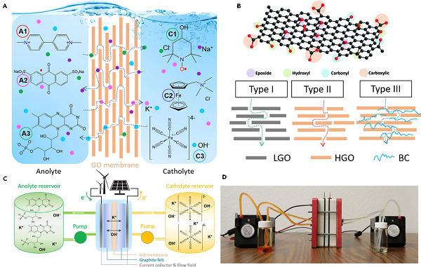 本文通过调控氧化石墨烯薄片表层的含氧官能团首次实现了氧化石墨烯膜在水系液流电池中的应用。通过石墨烯片层的重复堆积,三维连通的二维通道不仅可以实现多种一价离子的快速传导同时也可以实现对活性小分子的有效阻挡。