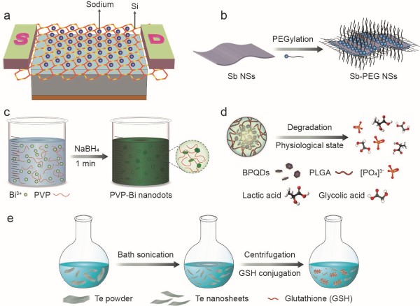 图四: 生物医学应用中新兴Xenes表面功能化策略的例子。(a) 碱金属对硅烯的表面吸附; (b)锑烯的聚乙二醇化; (c)聚乙烯吡咯烷酮涂覆铋烯; (d)将磷烯包封在PLGA聚合物中; (e)谷胱甘肽对碲烯的改性。