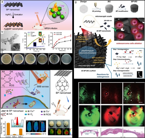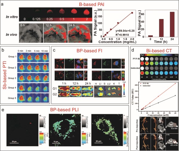 图六: 基于新兴Xenes的生物成像应用。例如,基于硼烯的光声成像、基于锑烯的光热成像、基于磷烯的荧光成像、基于铋烯的CT成像、以及基于磷烯光致发光成像等。