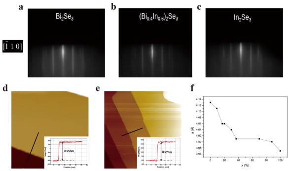 a-c) Bi2Se3, (Bi0.4In0.6)2Se3和In2Se3薄膜的反射式高能电子衍射谱(RHEED);
