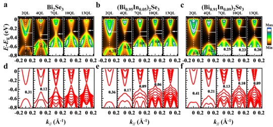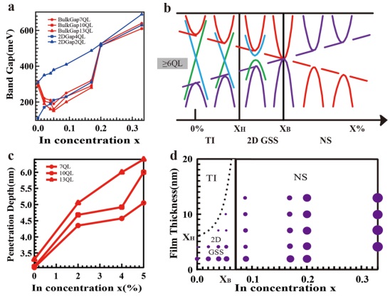 研究者细致地研究了(Bi1-xInx)2Se3薄膜电学性质随着层数和掺杂量x值的变化趋势。结合角分辨光电子能谱学(ARPES)和DFT带隙演化分析,确定了(Bi1-xInx)2Se3薄膜从一个特定相位到另一个已知拓扑的相位的演化过程。利用薄膜自身的层厚以及掺杂不同原子为操纵手段是研究拓扑材料的一种实用性强的方法。
