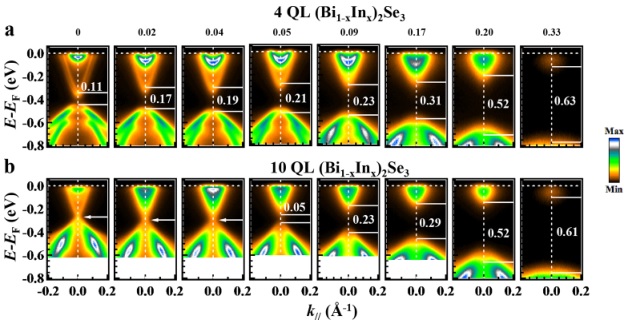 近日,国防HTH官网地址 大学,南方HTH官网地址 大学以及清华大学的团队研究了(Bi1-xInx)2Se3 (0≤x≤1)薄膜的拓扑性质及电子结构演化过程。团队利用分子束外延(MBE)的薄膜制备方式,精确控制(Bi1-xInx)2Se3的层厚和组份,并利用角分辨光电子能谱(ARPES)和DFT理论计算,对该体系的能带结构进行了系统地研究,进一步通过层厚和掺杂作为调控手段,研究了该体系的拓扑相变行为。