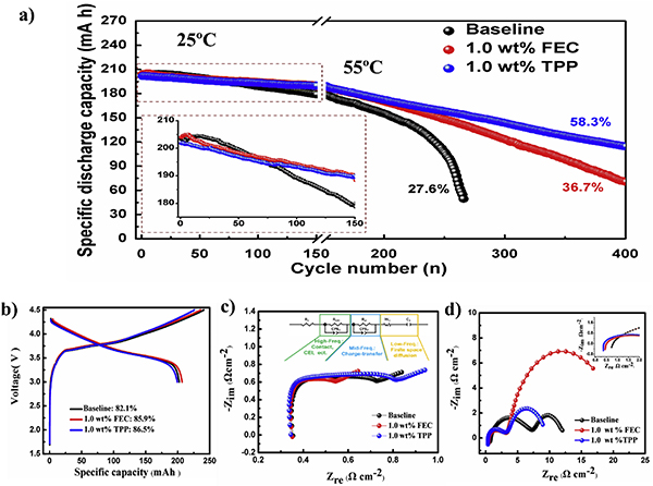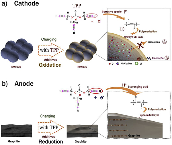 图六TPP添加剂在石墨│NMC532全电池正极和负极上的作用机理。