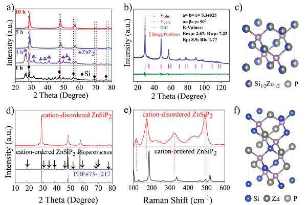 图1. 阳离子无序、有序ZnSiP2的合成与表征。