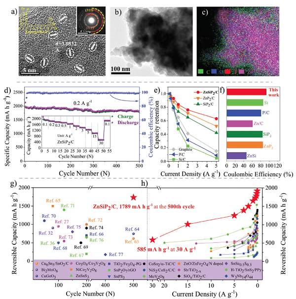 (g-h) 阳离子无序ZnSiP2/石墨复合材料与其它多相负极材料的循环和倍率性能比较。