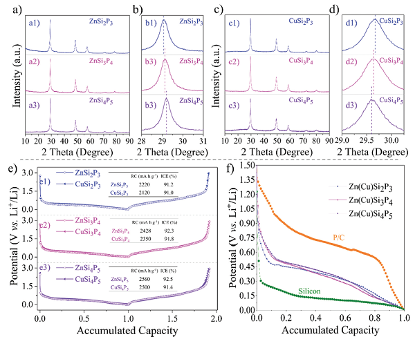 图5. 阳离子无序的Zn(Cu)-Si-P家族化合物的合成及储锂特性。