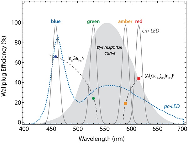 Figure 21.磷光体转换(pc)和颜色混合(cm)LED的发射光谱