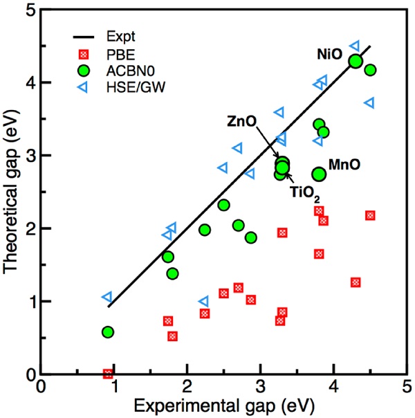 Figure 3.通过PBE、ACBN0、HSE/GW获得的理论值与实验的差距