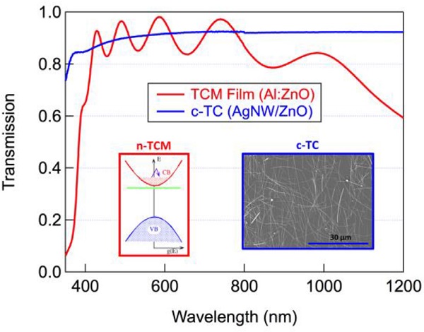 Figure 30.Al掺杂ZnO薄膜TCO与Ag-NW/ZnO复合透明导体透射光谱的比较