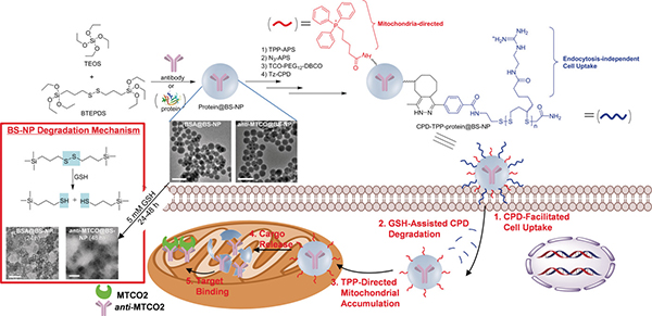 本文中,作者使用可生物降解的二氧化硅纳米体系实现了天然蛋白质/抗体的细胞内线粒体靶向递送。这些负载蛋白质的纳米粒子能够被细胞快速、高效地摄取,在靶向富集到线粒体后,这些二氧化硅纳米粒子能够在GSH存在时被降解,从而实现天然功能性生物大分子的释放。利用这些细胞内释放的大分子可以进行更加深入的功能研究,使得该策略有望用于针对亚细胞靶标的蛋白质或抗体药物疗法。
