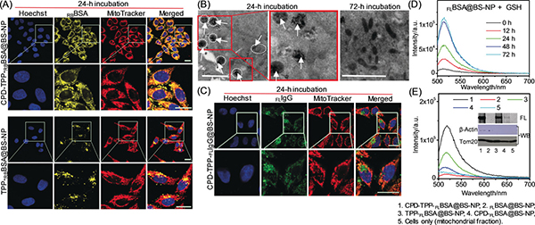 (B) 利用CPD-TPP-RBBSA@BS-NP处理的HeLa细胞的生物TEM图像(10 mg/mL;孵化24或72 h);