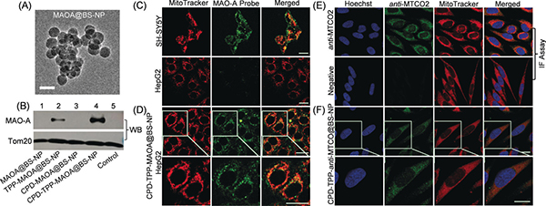 (B) 用不同MAOA@BS-NPs(50 mg/mL, 72 h)处理的HepG2细胞的线粒体组分的WB分析;