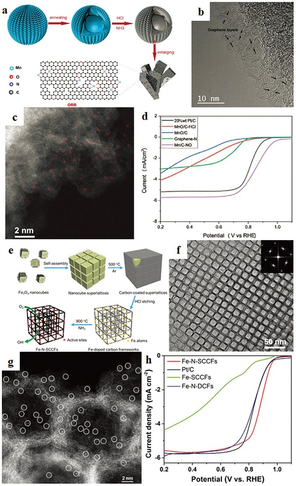 综上所述,作者认为采用模板法、自模板法、湿化学法等方法所制备的TM修饰的多孔碳纳米结构被认为是高效ORR电催化剂之一。同时,作者进一步总结了制备纳米结构具有高活性催化性能的指导原则:1)提高纳米催化剂比表面积;2)获得更丰富的介孔结构;3)提高多孔碳纳米结构的石墨化程度;4)掺杂杂原子;5)各组分原子以单原子形式分布均匀。此外,作者还指出,虽然最近的研究表明ORR的催化性能是令人满意的。然而,在进一步探索ORR催化剂方面仍存在一些问题:1)TM基催化剂的长期稳定性有待进一步提高;2)碳基催化剂的活性质量比不够高;3)对无热解的ORR催化剂的研究还需要进一步的探索;4)对ORR的反应过程需要更深入的了解,包括反应途径、活性位点的识别、界面行为等;5)建立标准的膜电极组装(MEA)测试条件和方法,提高MEA的测试性能。作者认为,研究高效、稳定的ORR催化剂对ORR电催化剂在能源和材料领域的进一步发展具有重要的意义。最后,作者期望这些合理的设计策略和活性位点的研究总结将有助于ORR电催化剂的开发,并在学术研究和工业应用中激发出更多的创新进展。