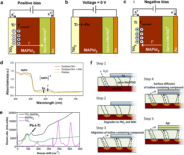 (a) 正向偏压下,碘离子迁移至空穴传输层,与氧化的spiro反应生成中性化合物;