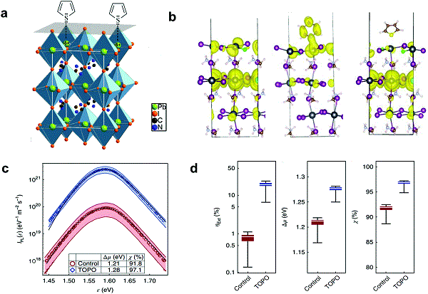 (d) 钙钛矿薄膜在TOPO(三辛基氧膦)处理前后外发光量子效率、准费米能级分裂和辐射极限费米能级分裂百分比参数统计分布。